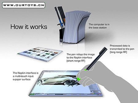 这种餐巾纸PC采用了一个单层柔性电路板与感应式电源电路,用特制的笔在上面勾画时,餐巾纸PC可以感应到你勾画的内容,然后就像电子墨水纸相同把你勾画的内容显示出来。