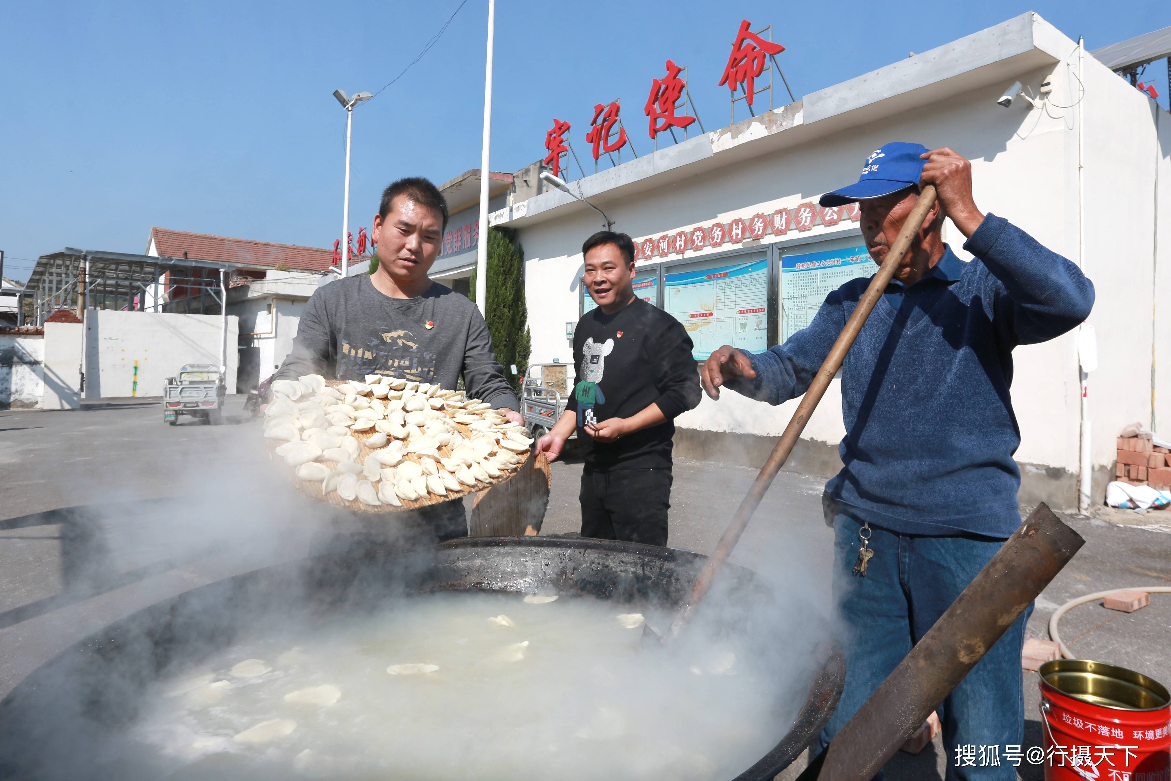 河南省安阳市殷都区磊口乡安河村,村党支部书记兼村委会主任郭志飞(中)、村干部李超端着志愿者包好的肉馅饺子正在下锅。