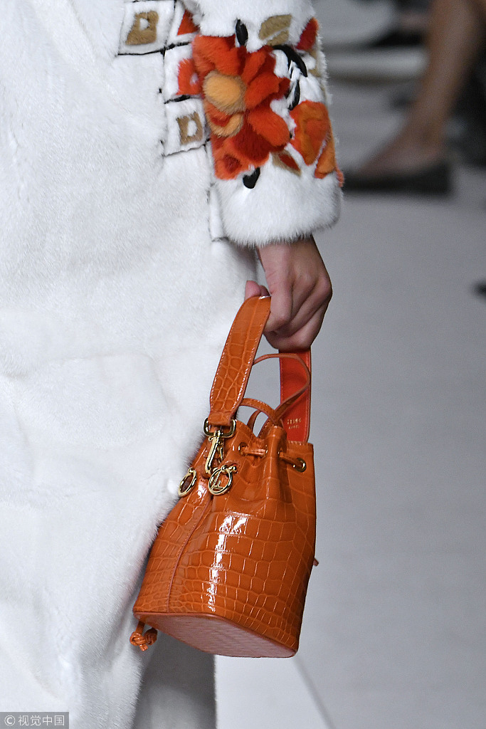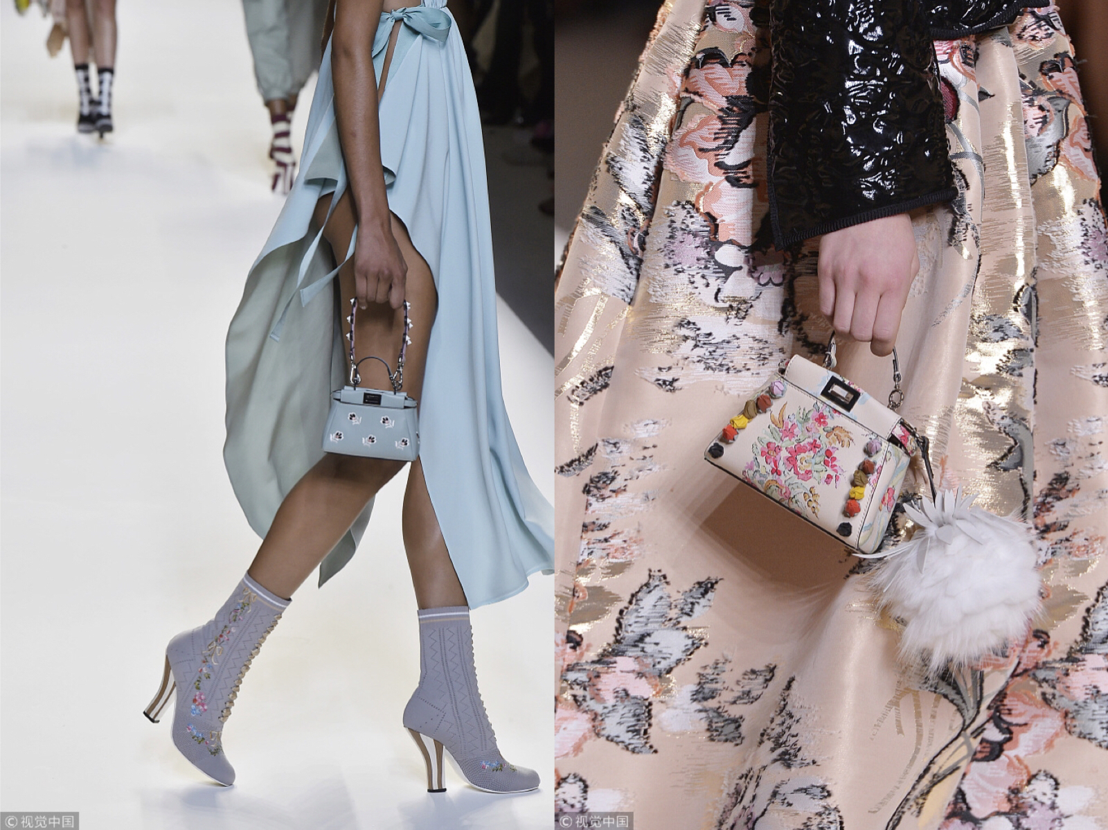 Fendi也是“迷你”包的爱好者。2017年春夏米兰时装周上,模特们就拎着一个比拳头大一些的“迷你”包走秀。
