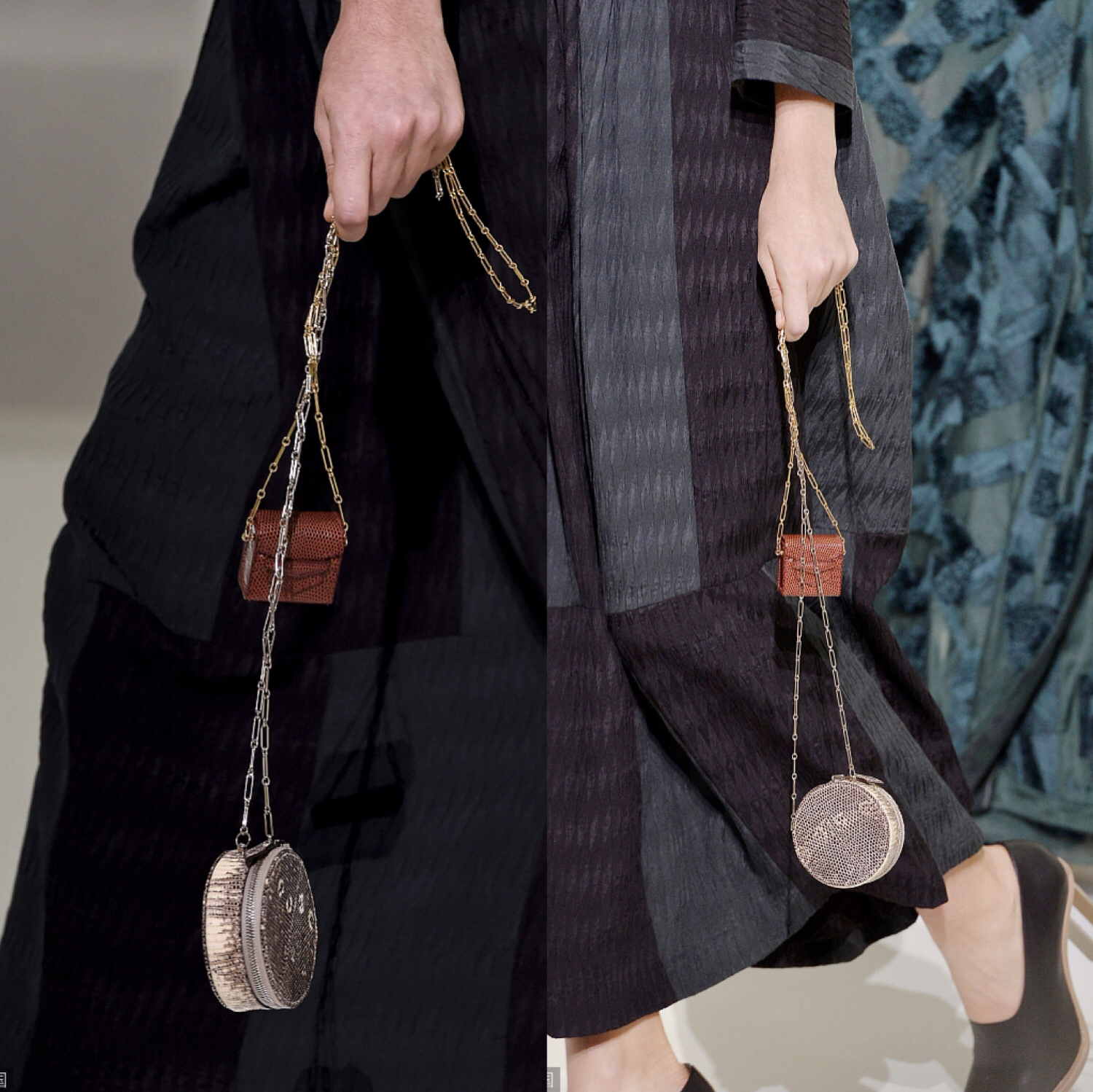 而更“迷你”的烟盒包、零钱包,几乎就像是模特手中的“悠悠球(YO-YO)”。