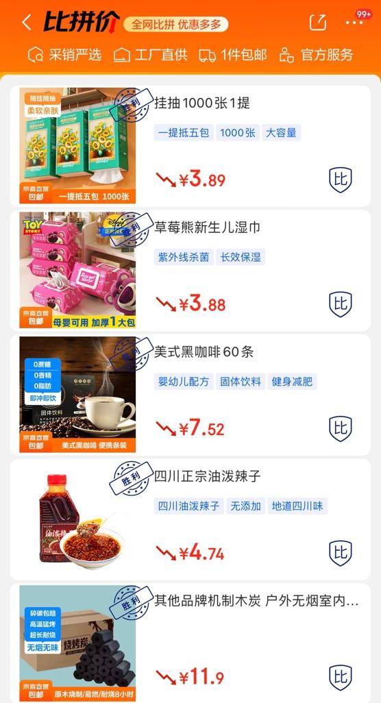 作为京东旗下特价购物平台,京喜直营采取新直营模式,推出“比拼价”,参与电商价格战。京喜直营深入工厂,优化生产、仓储、配送,从源头拿到真低价、真好货,因此价格更便宜,质量和服务也有保障。