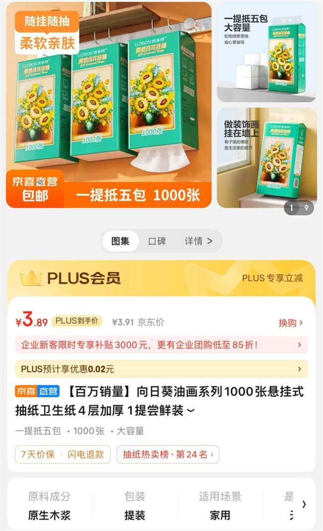 近日,京喜直营上线“比拼价”,逆市卷起抽纸新一轮价格战,将1000抽价格降至4元以下,并且支持单件3.89元包邮,相当于一张纸巾只需要3厘,3张才1分钱,远远低于其他平台的大促价格。