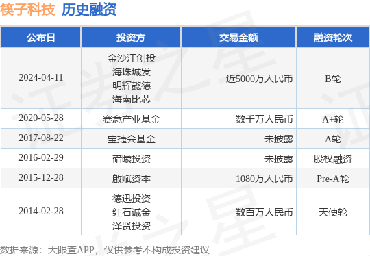 证券之星音讯,依据天眼查APP于4月11日发布的信息收拾,广州筷子信息科技有限公司完结B轮融资,融资额近5000万人民币,参加出资的组织包含金沙江创投,海珠城发,明辉懿德,海南比芯。