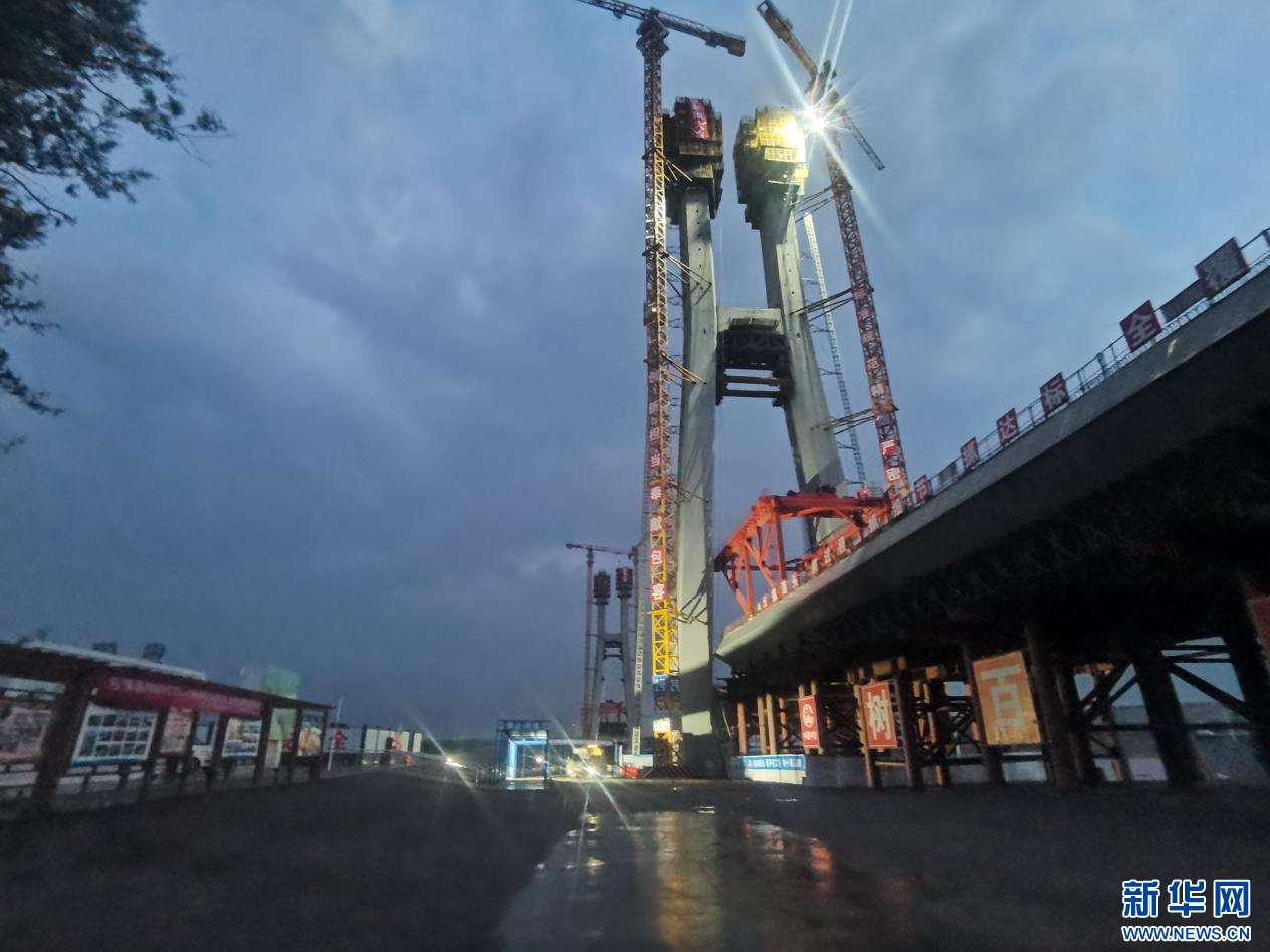 近来,在包银高铁项目乌海黄河特大桥工程项目施工现场,跟着最终一车混凝土泵送结束,跨过黄河主墩主塔上塔柱完结浇筑,标志着包头至银川高铁全线最高的桥梁——乌海黄河特大桥主墩主塔顺畅封顶。新华网发(黄建飞 摄)